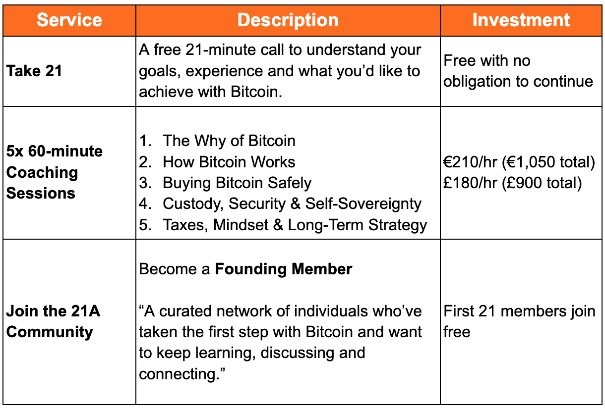 From curious to confident, in five private 1-1 sessions. You’ll gain a clear understanding of Bitcoin’s foundations, risks, and how to buy and hold it securely for the long term. See our services: